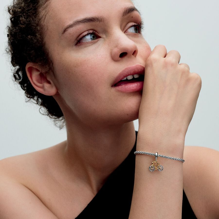Pandora brand charm from the Pandora Moments collection on the theme of travel & leisure with a two-tone bicycle.
