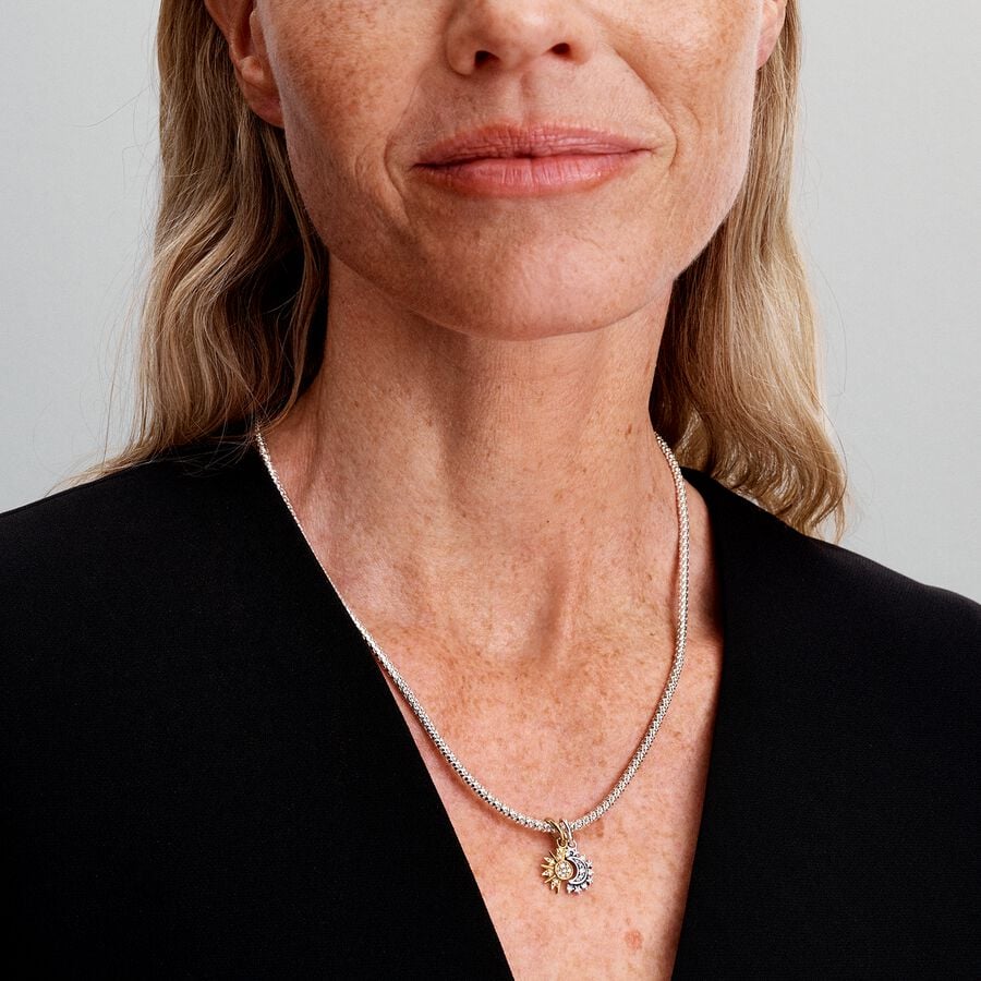 Celebrate the connection between light and dark with the Pandora Sun & Moon Separable Pendant Charm, a double jewel full of meaning and symbolism. Made in Pandora Shine™ (18k gold-plated sterling silver), this unique charm consists of two separable pendants : A radiant sun golden and a silver moon decorated withtransparent cubic zirconia.