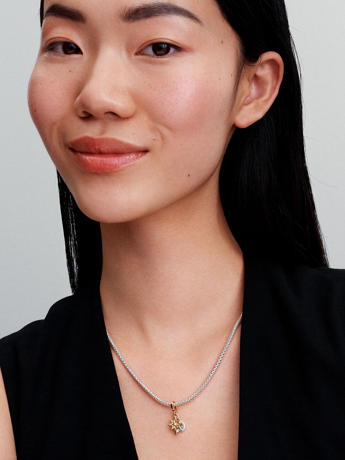 The Pandora Engravable Polar Star Pendant Charm with Synthetic Diamond is a 925/1000e silver piece, set with a synthetic diamond in the center, representing the polar star. This charm is customizable thanks to the free engraving, allowing you to add a personal touch. It is compatible with Pandora Moments bracelets and makes an ideal gift to celebrate precious moments.
