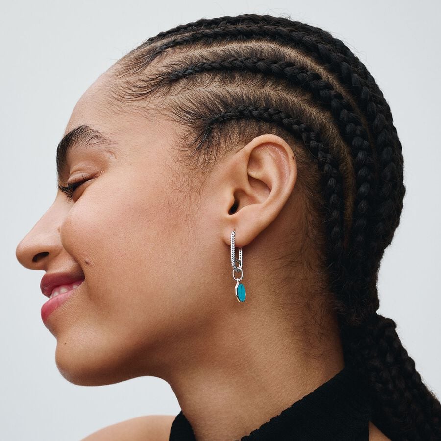 Pandora brand charm from the Pandora Me collection with an engravable medallion on the back with a synthetic turquoise on the front.