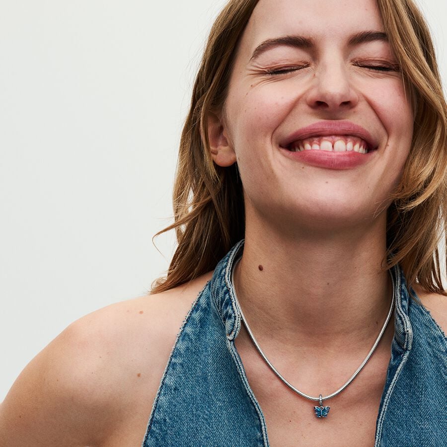 Bring a touch of lightness and color to your bracelet with the Pandora Blue Murano Glass Butterfly Pendant Charm. This poetic jewel in 925/1000 silver presents a translucent blue Murano glass delicately crafted, decorated with a openwork silver butterfly symbolizing transformation and freedom.